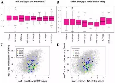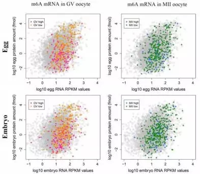 為了探索mRNAs甲基化是否與翻譯有關(guān),作者把mRNA甲基化數(shù)據(jù)與Smits等人已發(fā)表的轉(zhuǎn)錄組和蛋白組數(shù)據(jù)進(jìn)行了整合。通過(guò)BLAST分析,在RNA/蛋白數(shù)據(jù)中找到了723個(gè)m6A修飾mRNAs的信息。GV期或者M(jìn)II期卵母細(xì)胞中高m6A峰的RNA水平(log10 RNA RPKM值)比總RNA高(在卵或者胚胎中),但是蛋白水平(log10 protein amount / fmol)比總蛋白水平低(Figure 2)。與高度甲基化的mRNAs相比,低甲基化RNAs顯示出非常高的表達(dá)水平(Figure 3)。這些結(jié)果說(shuō)明在卵母細(xì)胞或早期胚胎中,m6A修飾可能與mRNA翻譯有關(guān)。