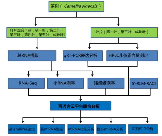本研究采用多種生物技術(shù)手段的聯(lián)合分析(高通量測(cè)序,降解組測(cè)序,qRT-PCR技術(shù)和5’-RLM-RACE技術(shù)),尋找到新的調(diào)節(jié)兒茶素生物合成的miRNA,并且驗(yàn)證了miRNA調(diào)控的切割位點(diǎn)。