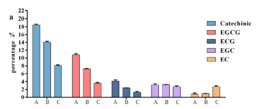 對(duì)茶樹1005葉片兒茶素含量的研究發(fā)現(xiàn),兒茶素在不同葉片中的的含量由高到低排序?yàn)椋旱谝蝗~,芽,第二葉,第三葉,成熟葉。第一葉,第三葉和成熟葉的兒茶素含量有顯著差異。