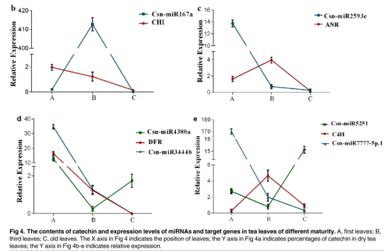 該研究共鑒定了69個(gè)保守的miRNAs和47個(gè)新的miRNA。再結(jié)合降解組測(cè)序的和生物信息分析的方法預(yù)測(cè)了受19個(gè)miRNA調(diào)控的16個(gè)基因切割位點(diǎn)。通過5’-RLM-RACE實(shí)驗(yàn)對(duì)其中5個(gè)有注釋的miRNA切割位點(diǎn)進(jìn)行了驗(yàn)證。qRT-PCR結(jié)果顯示:novel-miR1, novel-miR2,csn-miR160a, csn-miR162a, csn-miR394 和 csn-miR396a與兒茶素含量負(fù)相關(guān)。6個(gè)miRNA(csn-miRNA167a,csn-miR2593e,csn-miR4380a,csn-miR3444b,csn-miR5251和csn-miR7777-5p.1)及其與兒茶素生物合成相關(guān)的靶基因的表達(dá)也通過qRT-PCR進(jìn)行了分析;這些miRNA和兒茶素含量之間呈正相關(guān)和負(fù)相關(guān),而在其目標(biāo)基因和兒茶素含量之間呈正相關(guān)。這個(gè)結(jié)果表明這些miRNA可能通過下調(diào)它們來負(fù)調(diào)節(jié)兒茶素生物合成生物合成相關(guān)靶基因。綜上所述,miRNA是茶葉中關(guān)鍵的調(diào)節(jié)因子,5′-RLM-RACE和表達(dá)分析的結(jié)果揭示了miRNAs在兒茶素合成代謝中的重要作用。
