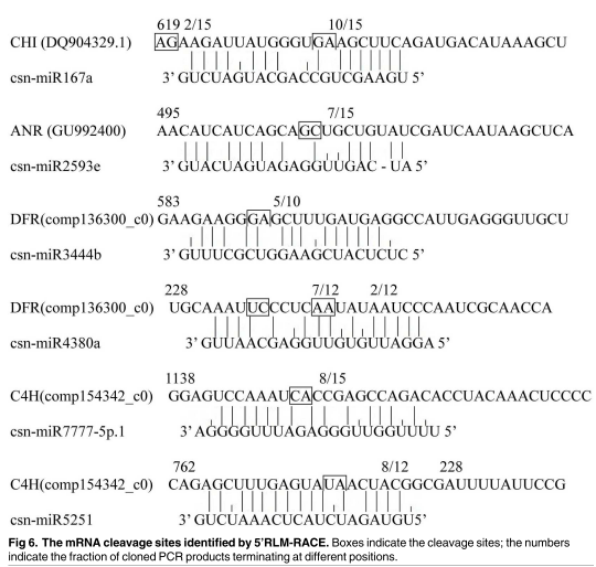 為了深入了解miRNA在調(diào)控兒茶素合成代謝中的功能,研究人員將高通量測(cè)序獲得的miRNA跟NCBI數(shù)據(jù)庫(kù)以及RNA測(cè)序的兒茶素生物合成相關(guān)基因的mRNA進(jìn)行BLAST,預(yù)測(cè)可能的miRNA。為了消除假陽(yáng)性,對(duì)預(yù)測(cè)的斷裂位點(diǎn)進(jìn)行實(shí)驗(yàn)驗(yàn)證。通過5’-RLM-RACE實(shí)驗(yàn)驗(yàn)證了6個(gè)可能參與兒茶素生物合成功能基因表達(dá)調(diào)控的miRNA。它們分別是csn-miRNA167a、f csn-miR2593e、csn-miR4380a 、csn-miR3444b 、csn-miR5251 和csn-miR7777-5p.1。