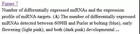 c) IDEG6軟件分析( |FC| >2)進行差異表達分析,兩個時間點在兩個品系間分別檢測得到45、65個差異表達microRNA。值得注意的是,如圖7所示,除了miR1140 與miR827, 抽薹時間點上的所有已知 差異表達miRNAs 均在 品系Purler中上調,這其中包括3個miR156 家族 與6個 miR395 家族microRNA,相反,花發(fā)育早期時間點上的所有差異表達miRNAs 均在 品系Purler中下調。