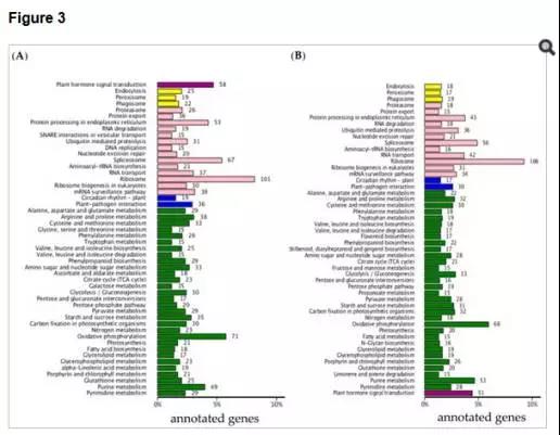 d)對兩個時間點所有差異基因進行KEGG通路分析,其中3297個基因注釋到了KEGG數(shù)據庫 ,其中大多數(shù)基因注釋到了 ribosome 、oxidative phosphorylation相關代謝通路。值得注意的是,在兩個時間點分別有58、51個差異基因注釋到了植物激素信號通路,進一步分析發(fā)現(xiàn),這些通路大多為BR或auxin信號轉導通路。該部分結果如圖3所示。