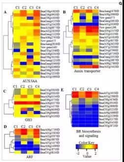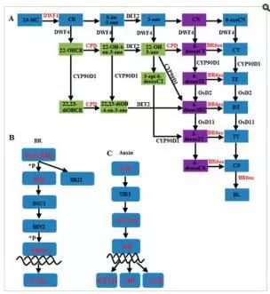 e)圖4展示了在BR生物合成、BR信號轉導通路、auxin信號轉導通路上鑒定到的差異表達基因。這些差異基因中,BR6OX調控了BR生物合成過程中multiple C-6C的氧化過程;DWRF1催化24-methylenecholesterol轉化為campesterol,該過程為BR生物合成的第一步;分布在BR信號轉導通路上的差異基因包括 BRI1, BSK, BZR1, and CYCD3等, 這些基因多在品系 Purler中下調 (見圖 5E);分布在 auxin 信號轉導通路上的基因包括 AUX1, IAA, GH3, ARF等,其中 IAAs, GH3s, ?ARFs 在兩個時間點的 Purler品系材料中均表現(xiàn)為上調。